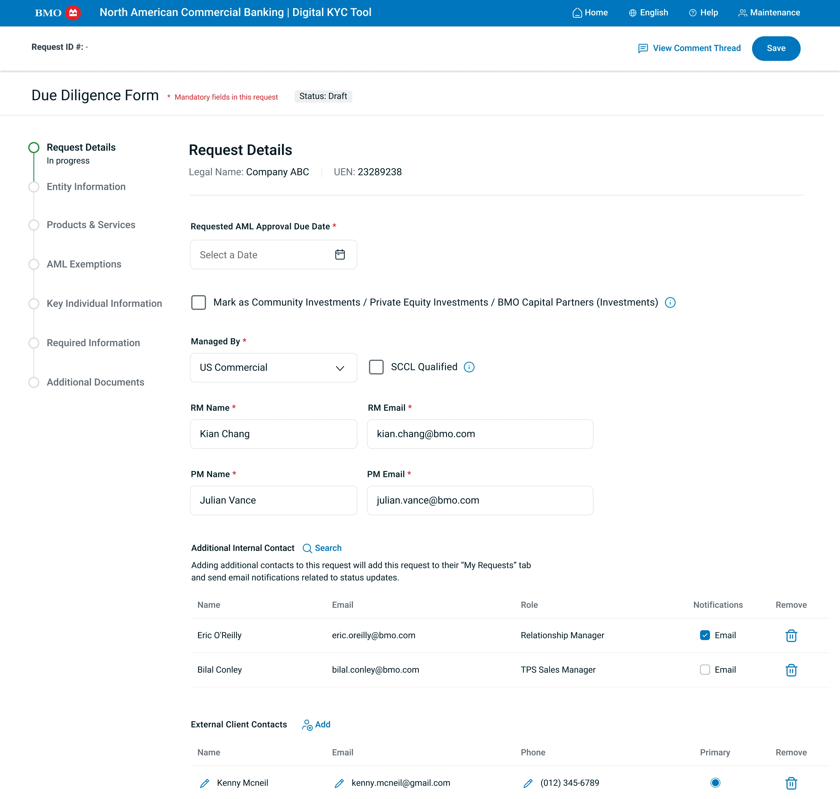 We mapped the KYC lifecycle across bankers and AML analysts, reviewing the legacy PowerApps form and shadowing live reviews. This allowed us to trace exactly where requests stalled or required manual rework.